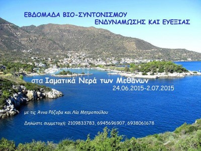 Στις αρχές του καλοκαιριού, από 24.06 2015 έως 2.07.2015, σας καλούμε για μια απόδραση από την ένταση και το στρες της πόλης, για θεραπεία και αναζωογόνηση σε ένα από ομορφότερα μέρη της Πελοποννήσου, στη Χερσόνησο των Μεθάνων, γνωστή από την αρχαιότητα λόγω των ιαματικών πηγών της.