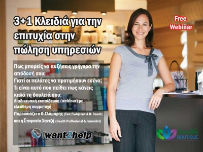 Η Health-Boutique.com σε συνεργασία με το iwant2help training & coaching, διοργανώνει διαδικτυακό σεμινάριο με ελεύθερη συμμετοχή για επαγγελματίες στο χώρο των υπηρεσιών σήμερα Πέμπτη 15 Σεπτεμβρίου από τις 21:30 έως τις 22:15.