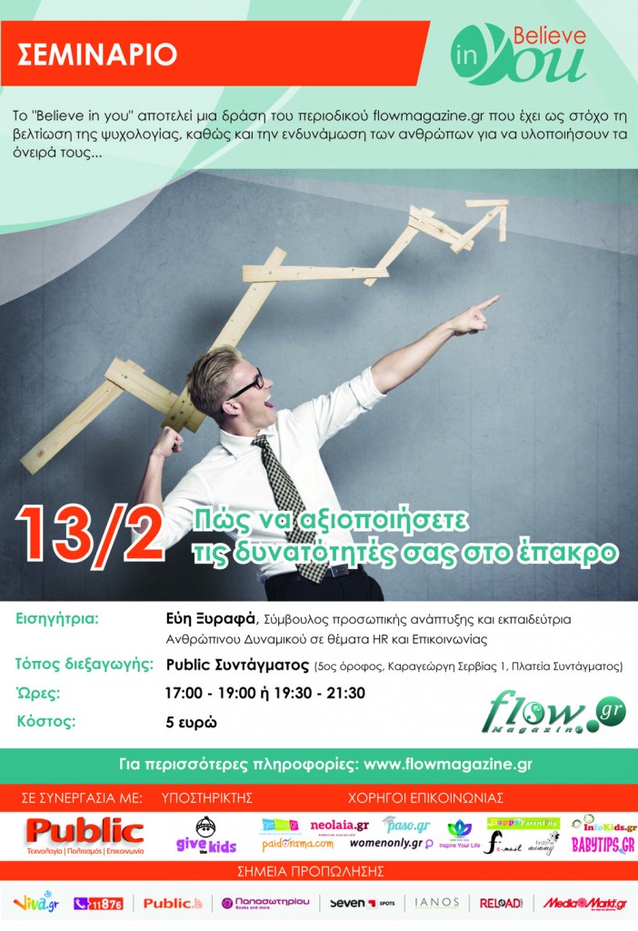 Η δράση Believe in you του ηλεκτρονικού περιοδικού flowmagazine.gr συνεχίζει με ένα σεμινάριο με θέμα «Πώς να αξιοποιήσετε τις δυνατότητές σας στο έπακρο». Το σεμινάριο θα υλοποιηθεί δύο φορές και είναι ανοιχτό στο ευρύ κοινό.