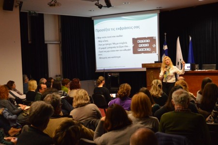 Ομιλήτριες ήταν η κ. Ερατώ Χατζημιχαλάκη, οικογενειακή σύμβουλος, και η κ. Εύη Ξυραφά, σύμβουλος προσωπικής ανάπτυξης οι οποίες έδωσαν τις κατευθυντήριες γραμμές στο κοινό που, με ερωτήσεις και παραδείγματα, αποκάλυψε τις έγνοιες γονιών και δασκάλων σήμερα.