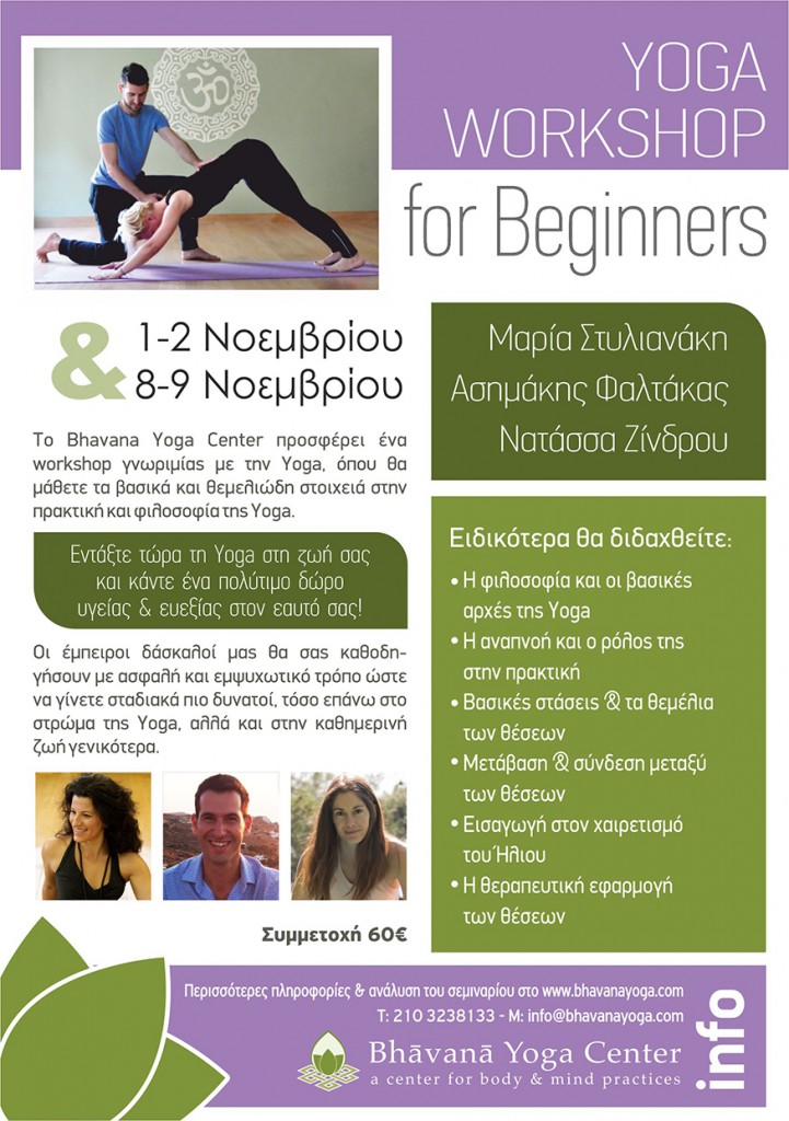 Το Bhavana Yoga Center προσφέρει ένα workshop γνωριμίας με την Yoga, όπου θα μάθετε τα βασικά και θεμελιώδη στοιχειά στην πρακτική και φιλοσοφία της Yoga.